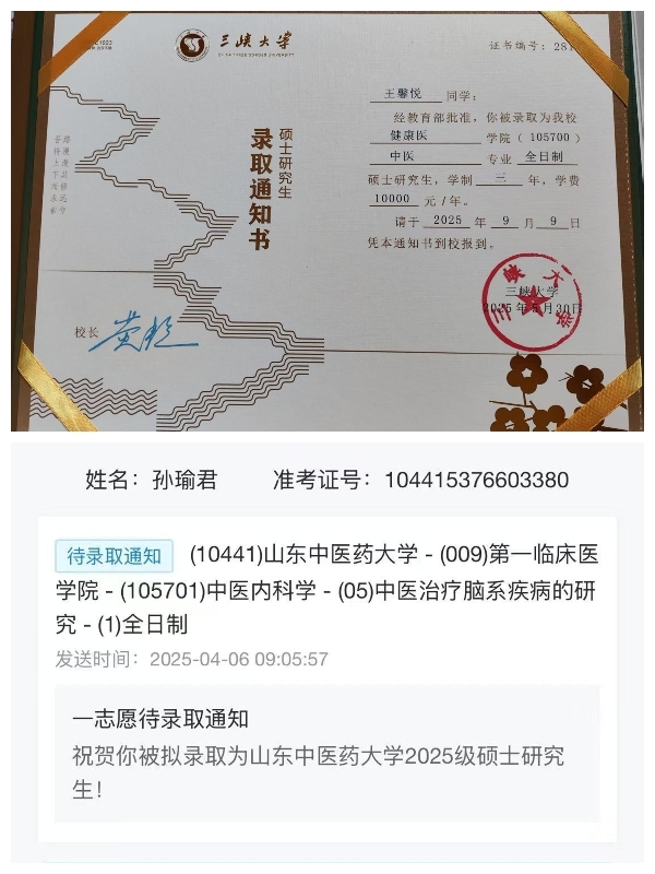 王馨悦以成人本科学历挑战全日制中医专硕,备考期间曾因跨考压力多次调整学习策略,却始终秉持“尽人事方知天命”的信念,最终在激烈竞争中被三峡大学录取;孙瑜君则在本科阶段便明确报考山东中医药大学中医内科学脑病方向,“最终以扎实的专业功底和对脑病方向的清晰认知,成功考入山东中医药大学中医内科学(脑病方向)专硕。