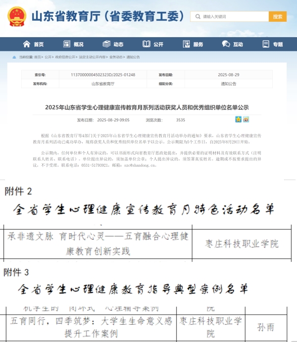 近日,山东省教育厅公布了2025年山东省学生心理健康宣传教育月系列活动获奖名单。我校在本次活动中表现突出,申报的心理健康工作典型案例和特色活动项目均获奖,充分展现了我校在学生心理健康教育工作方面的扎实成效。
