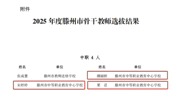 近日,滕州市教体局公布2025年骨干教师选拔结果,滕州市中等职业教育中心学校颜丽桥、宋婷婷、栗忍三位教师凭借出色的教育教学能力和突出的工作业绩,成功评选为滕州市骨干教师。