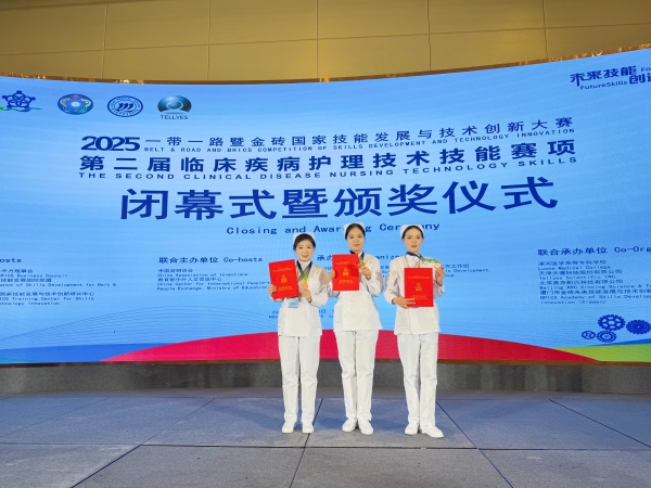 11月20日至23日,2025“一带一路”暨金砖国家技能发展与技术创新大赛第二届临床疾病护理技术技能赛项在漯河收官。我校医药卫生学院罗梦谣、董小琳、陈博妍组成的护理团队首次参赛,凭借扎实专业功底与出色临场应变,从全国49支队伍中脱颖而出,斩获三等奖。