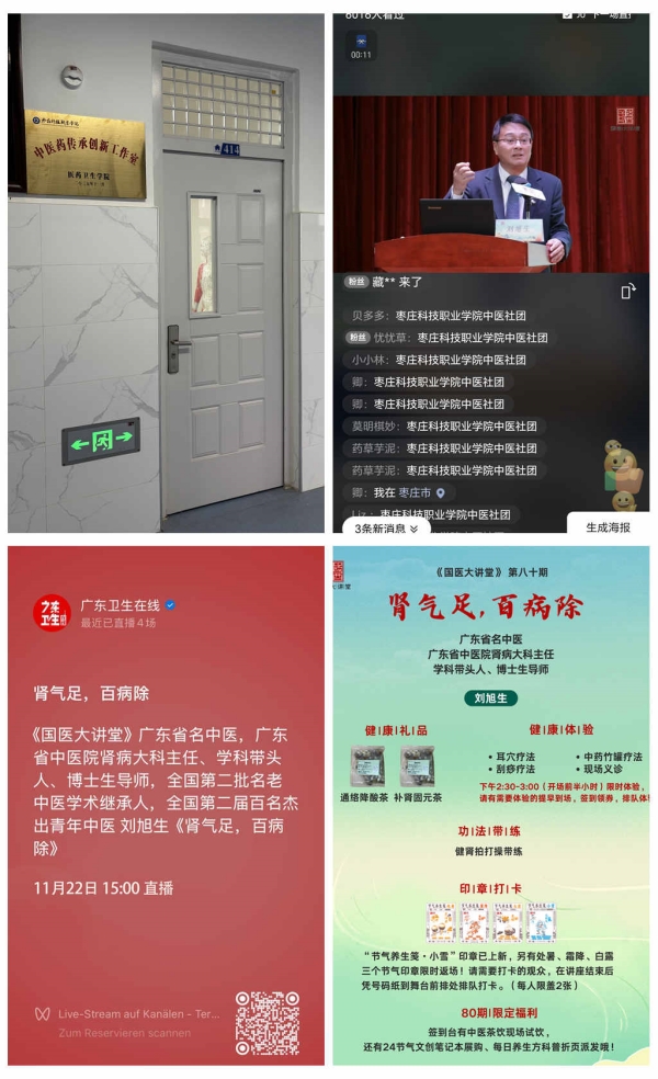 小雪时节,养生正当时。11月22日,医药卫生学院中医药传承创新工作室组织中医社团师生,云端观看了由广东省中医药局主办的第80期《国医大讲堂》线上直播。本次讲座主题为《肾气足,百病除》,特邀广东省名中医、广东省中医院肾病大科主任刘旭生教授担任主讲,为线上线下观众深入浅出地讲解了养肾护肾的中医冬季养生智慧。