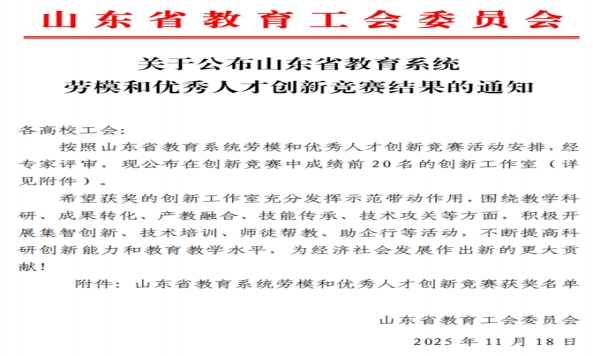 此次竞赛旨在深入贯彻党的二十大和二十届历次全会精神,落实习近平总书记关于创新驱动发展的重要论述及视察山东的重要讲话精神,进一步激发教育系统劳模、工匠、名师等优秀人才的创新活力,推动新质生产力的培育与发展。赛事聚焦团队建设、规范管理、创新成果、人才培养与社会效益五个维度,全方位考评各工作室综合水平。经资格审核、专家评审等多个环节的严格筛选,共有来自全省20所高校(含高职院校)的创新工作室入选2025年度山东省教育系统劳模和优秀人才创新工作室名单。