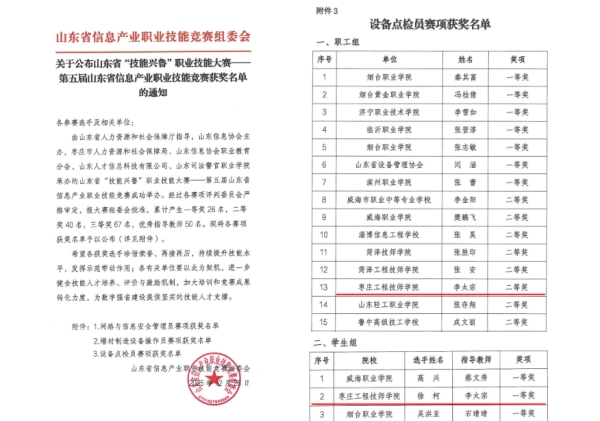 枣庄工程技师学院师生在第五届山东省信息产业职业技能竞赛中取得佳绩