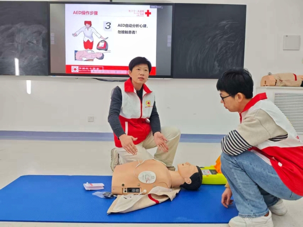 活动中,省红十字会应急救护员白丽娟老师通过视频演示与现场模拟,详细讲解了心肺复苏的操作要领;救护员倪晓菲则借助实物演示与急救口诀,生动传授AED使用及海姆立克急救法的关键步骤。教学深入浅出,互动频繁,参训师生专注聆听、积极演练。
