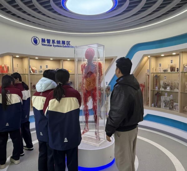 在高考教学部主任阮传伟、党支部书记孔德峰的全程带领与医药卫生学院牛雯铃老师的专业讲解下,学生们依次参观了生命诞生、人体系统、病理标本等主题展区。从胚胎发育到人体九大系统,从病理对比到中医药文化,生动的实物与讲解不仅展示了生命的精妙,也融入了对生命意义、奉献精神的思考。在人体标本展区,捐献者无私奉献的事迹深深触动了学子,让大家深刻体会到生命的厚度与价值,进一步坚定了学好技能、服务社会的信念。