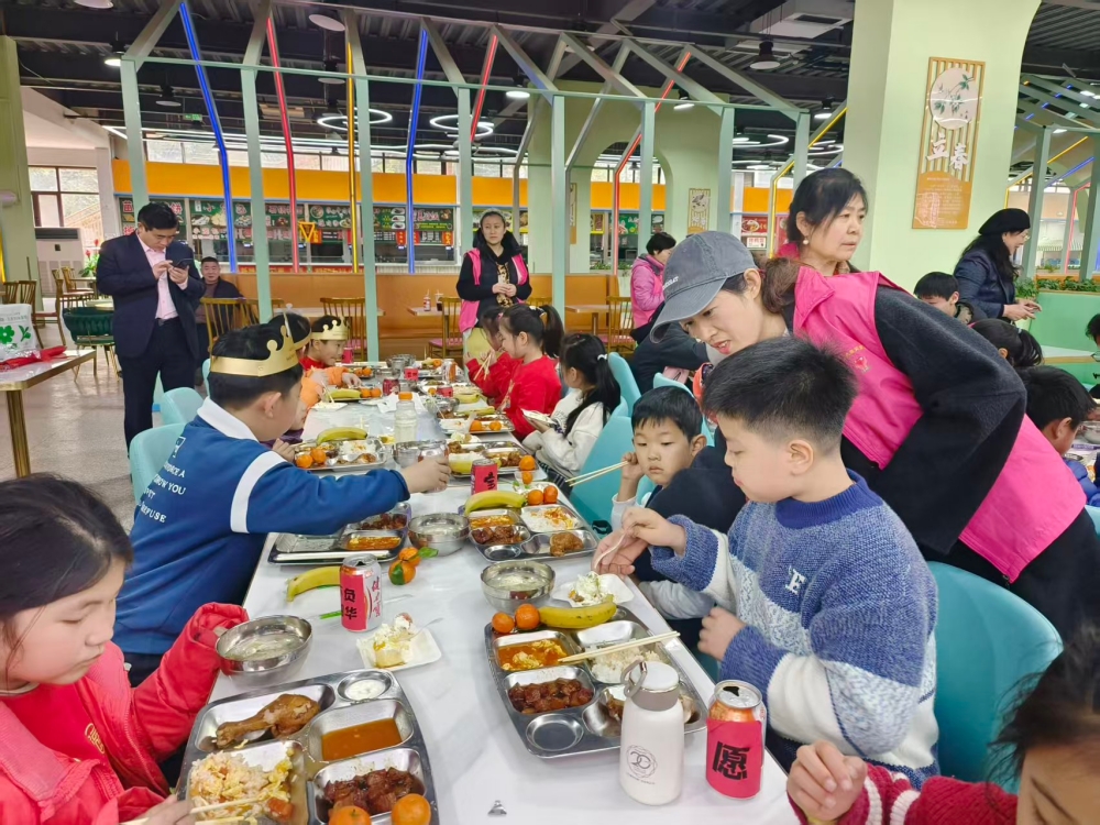午餐时段,在学校第二餐厅的全力支持下,一场充满温情的 “爱心午餐”暖心开席。工作人员为孩子们准备了营养均衡、美味可口的饭菜,尽显细致关怀。志愿者们为孩子们添饭、递水,用拉家常的方式拉近心理距离,让餐厅不仅成为满足味蕾的场所,更成为传递温暖的港湾。一碗热饭、一句问候、一份陪伴,点滴细节中彰显着对留守儿童的真切关爱,传递出校园大家庭的温暖。
