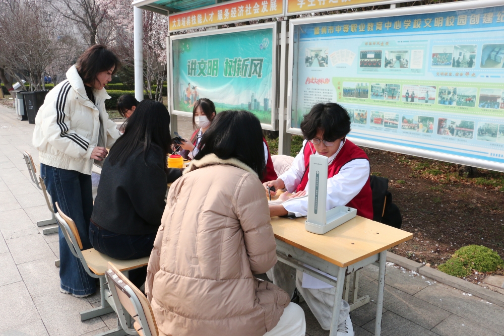 医疗志愿服务队在校园广场为师生提供免费血压、血糖监测服务。志愿者们提前备好监测仪器,耐心为前来检测的师生测量数据,并结合检测情况讲解血压血糖健康知识及日常养生技巧。