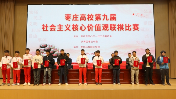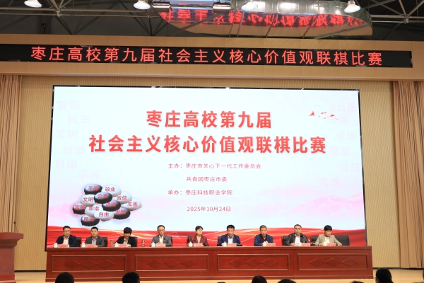 10月24日下午,由枣庄市关工委、团市委联合主办,由我校承办的枣庄高校第九届社会主义核心价值观联棋比赛在学术交流中心二楼报告厅顺利举行。枣庄市关工委副主任、枣庄学院关工委常务副主任徐玲出席并讲话,枣庄科技职业学院党委书记谢宝华致辞,滕州市关工委主任李健、枣庄市青年发展中心主任张强、滕州市关工委副主任胡瑞琳、共青团滕州市委副书记张恩铭、枣庄市关心下一代工作服务中心主任魏艳秋、滕州市关心下一代工作服务中心主任任海涛、学校组织人事部(统战部)部长秦峰等出席活动。枣庄市关工委副秘书长冯仰军主持。
