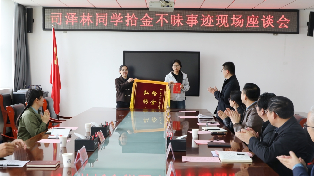 座谈会上,刘进静宣读了表彰司泽林同学拾金不昧行为的表扬信,为其转赠锦旗,高度赞誉她的诚信品质与责任担当。司泽林在滕州市图书馆岗位实践期间,始终坚守岗位、履职尽责,以细致耐心的态度服务每一位读者。整理阅览区域书籍时,她发现书中夹有1600元现金,面对意外之财毫不动心,第一时间将现金完整上交图书馆工作人员,并主动协助核对信息、联系失主,最终让遗失现金顺利归还失主,失主对此深表感激,多次向她致谢。