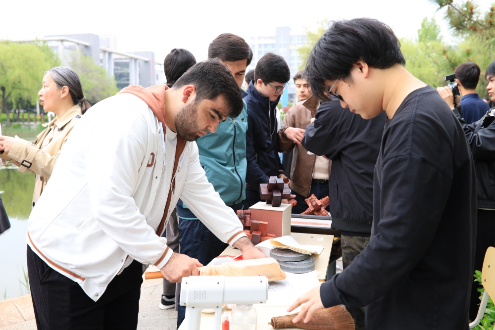 活动采用“一主线+多点位+循环展演”模式,集游园打卡、互动体验、舞台表演于一体,让留学生在沉浸式体验中感受中华文化魅力。现场设置十大特色体验区,各社团与特色品牌项目轮番亮相,亮点纷呈。在笔墨书香体验区,三希堂书法社社员指导留学生握笔蘸墨,书写福字、姓名与吉祥短句,一纸一墨间尽显汉字之美;指尖非遗区里,剪纸社带来传统窗花、福字剪纸教学,中外学子携手创作,红纸翻飞间剪出浓浓中国风;棋艺对弈区中,社会主义核心价值观联棋社与传统中国象棋、围棋、五子棋吸引众多爱好者切磋交流,感受东方博弈智慧。鲁班工坊匠心造物区备受青睐,鲁班锁拆解拼装、简易榫卯体验,让大家直观领略中国古代工匠智慧与工匠精神;非遗柳琴戏体验区特邀非遗传承人登台,经典选段婉转悠扬,戏服、脸谱、传统乐器展示引得留学生试穿体验、学唱念白,近距离感受非遗魅力。